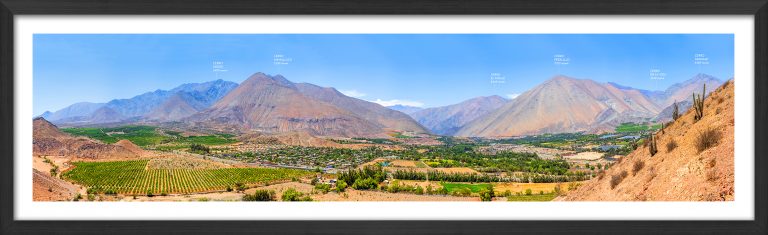 Cuadro Fotografía panorámica en alta calidad de impresión del Místico Valle del Elqui/Sector Pisco Elqui junto a sus cerros ubicado en la Región de Coquimbo para tu hogar/Oficina.